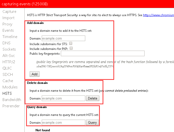 有的https证书没有经过验证,默认是拒绝访问的,可以通过设置强制打开。选择HSTS选项卡,添加Domain;也可在下方删除和查询domain