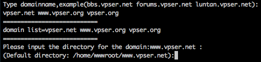 再输入要另外绑定的域名,多个域名可以用空格隔开。比如我要添加的站是多个域名都是访问一个站,输入 vpser.net www.vpser.org vpser.org 回车。
