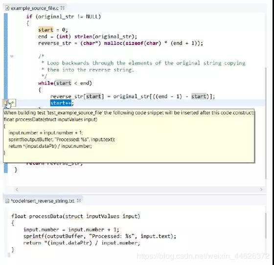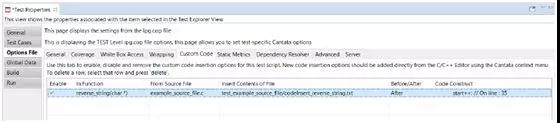 插入的代码存在单独的文件中,可以由一个或者多个测试脚本使用,通过新的测试属性工具栏和C/C++编辑器来控制。