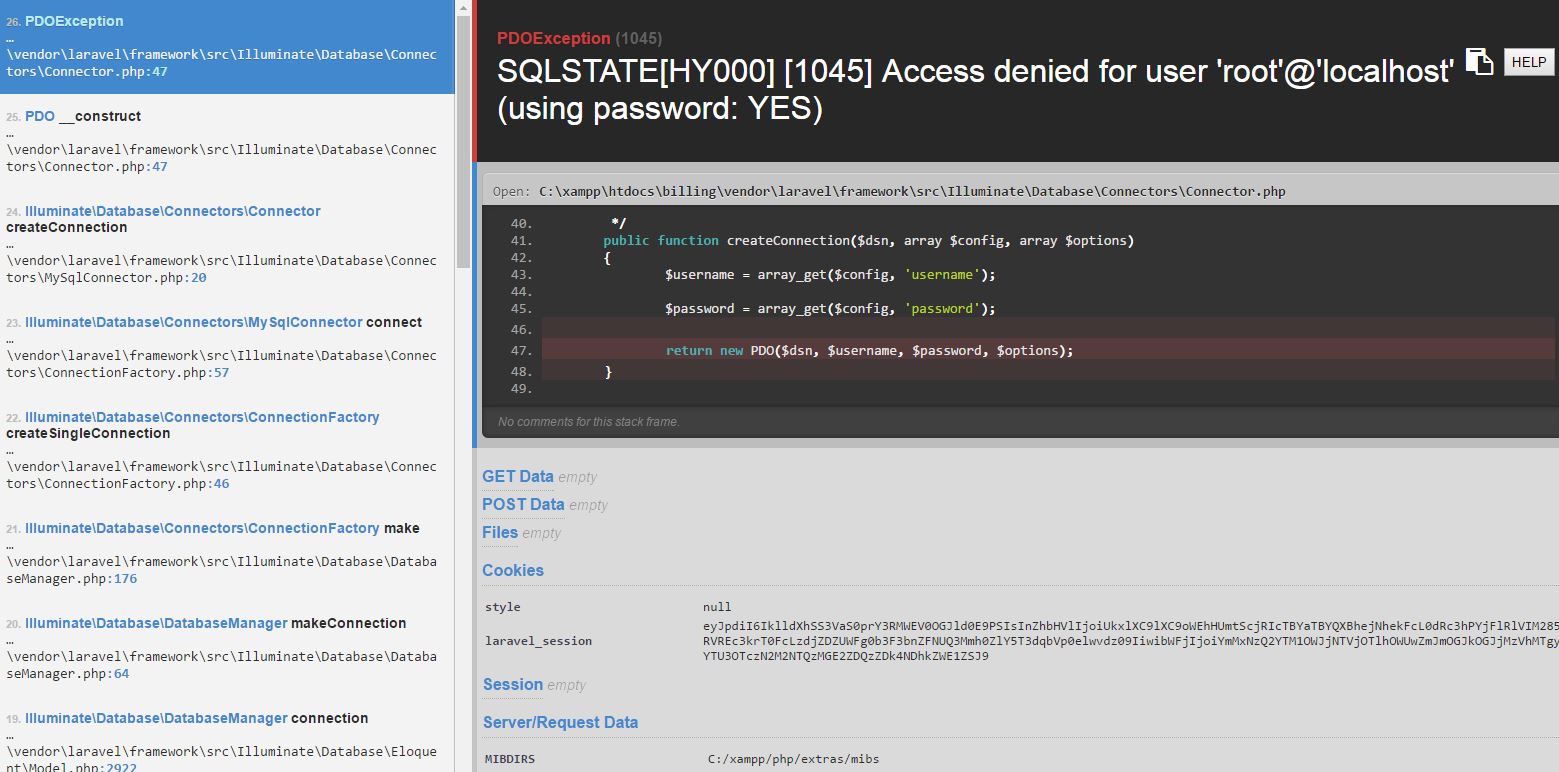 PDOException (1045) SQLSTATE[HY000] [1045] Access denied for user 'root'@'localhost' (using password: YES)