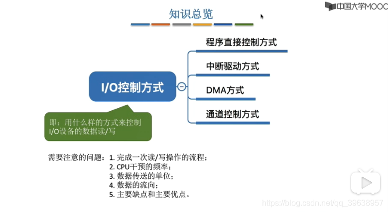 IO逻辑: CPU 通过控制线告诉IO逻辑指令类型,通过地址线告诉IO逻辑要操作的设备地址,IO逻辑通过访问控制寄存器和状态寄存器得出指令。如果是输出指令的话,IO逻辑将数据寄存器中的数据 转移到 控制器与设备的接口。