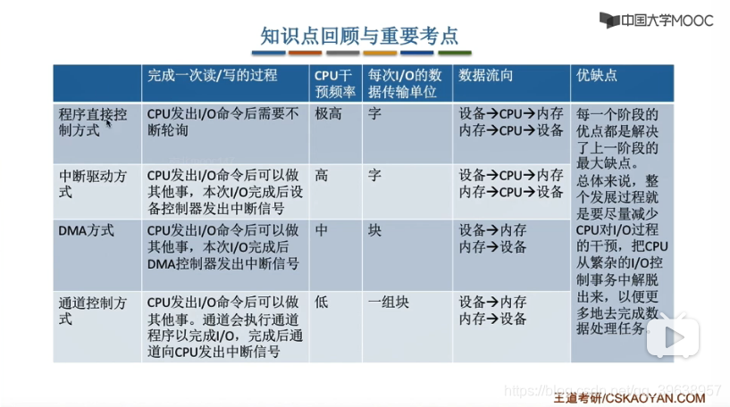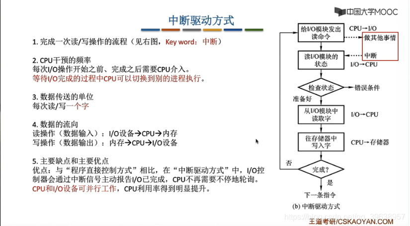 当CPU发出读写指令后,不再等待,将等待进程阻塞,转而执行其他进程,直到状态寄存器满足条件后,发出中断请求,CPU每执行完一条指令后就会检查中断,当发现中断后,读取一个字节(注意,仍然只能读一个字节,所以只有鼠标键盘能采用这种方式)。