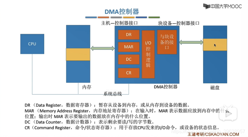 值得关注的是,DMA控制器中的MAR(Memory Address Register),存放的是数据在内存中的位置(DMA方式不需要CPU中介,直接在IO控制器和内存间传递,IO控制器与内存是通过系统总线直接相连的)