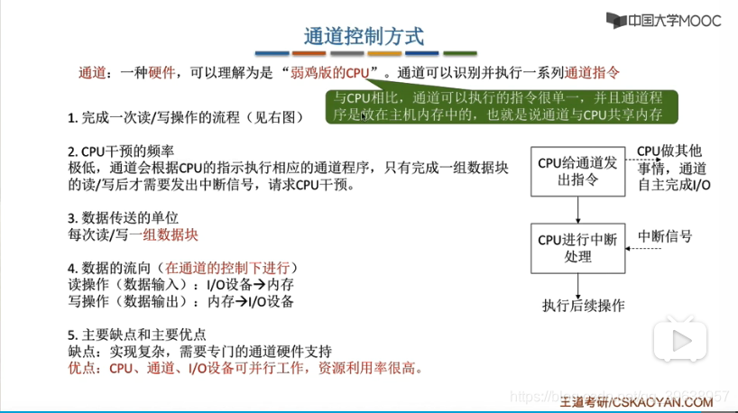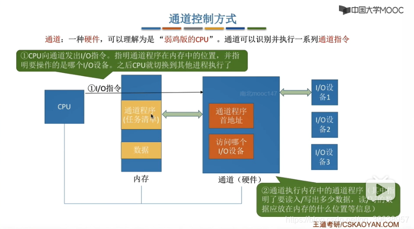 CPU只需要告诉通道 它所要执行的指令在内存中的位置,由通道负责IO。这些通道指令说明了访问哪个IO设备,数据要放在内存中的什么位置。