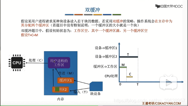 因此,单缓冲情况下,平均处理一个块的用时为 max(T,C)+M