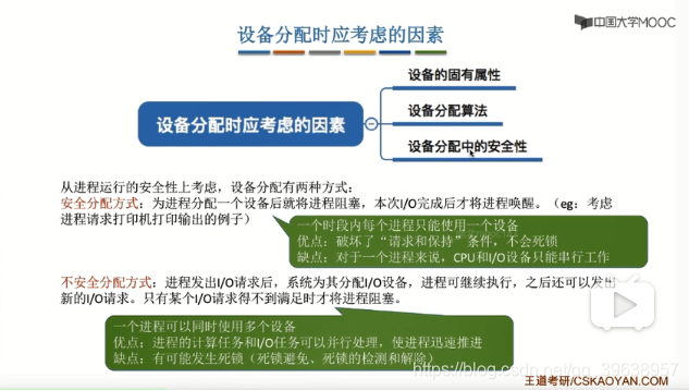 不安全分配:发出IO请求后,进程不需要等待IO结束,而是接着执行,可以再申请IO设备。可以使用银行家算法来避免不安全状态(分配IO设备资源之前计算分配掉的话会不会造成银行家问题的破产)