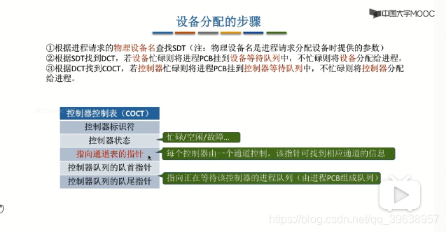 检测设备控制表的状态信息,如果空闲则分配给进程,如果忙碌则将进程挂到该设备的阻塞队列中。同时将对应的IO控制器控制表也分配给进程