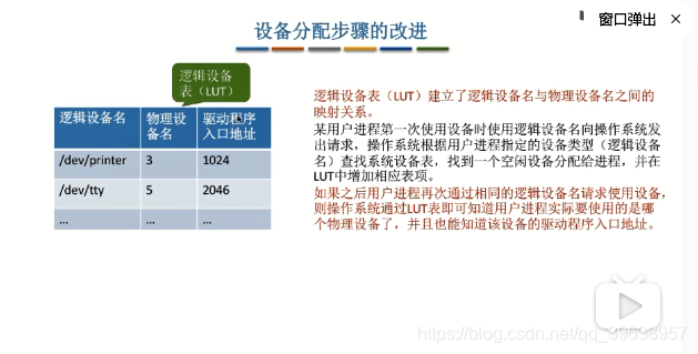 用户只提供逻辑设备名,根据逻辑设备名 查找 系统设备表,逻辑设备名其实就是设备类型,查找系统设备表中任何一个设别类型相符的设备就可以分配给进程。同时还要在逻辑设备表LUT中添加一个逻辑设备名--物理设备名--驱动程序入口地址表项。