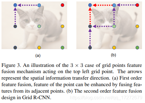 但是这样只利用一个heatmap来生成相应的网格点,还存在问题,假如某个网格点在背景区域,那么该区域获得的信息是不足以精确定位目标物体边界的,如下图中左上角的蓝色点,对于这样的网格点就需要融合周围的网格点对应的heatmap来对其进行校正。