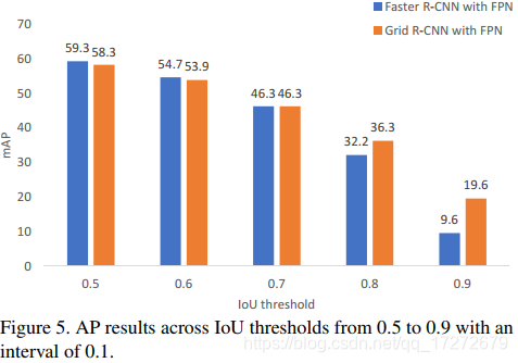 下图很有意思,显示了不同IOU标准下faster R-CNN和Grid R-CNN的输出结果,可以清晰的看出IOU标准越高反而相对效果越好,作者解释这表示Grid R-CNN主要是通过提高定位框精度实现检测效果提升的,但对这里存疑,按照Grid R-CNN的实现流程应该在各个IOU标准上都有所提升才对,作者也没有指出在RPN部分用以区分正负样本的IOU阈值为多少,若阈值为0.7还能对下图的结果有所解释。