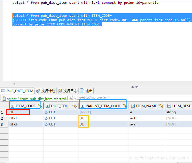 全部执行完后,蓝色标注是父亲和儿子对应的关系,通过父亲的01找到儿子的01,这就是connect by的作用。