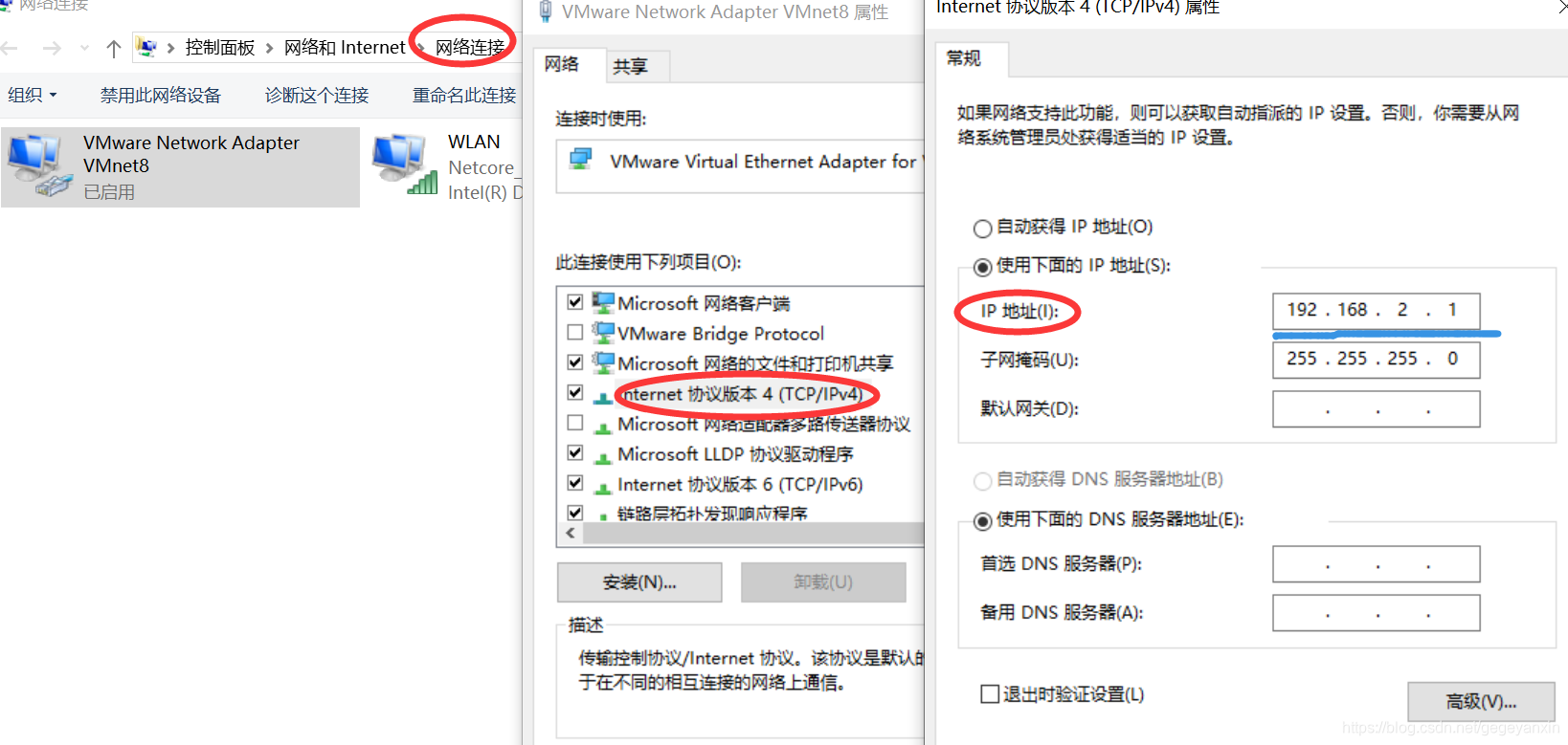 这是对VMware的设置,接下来是对每个虚拟机的设计。需要在这个网段内。ip地址最后一位避开0,1,2就好。