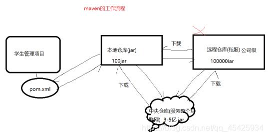 maven的工作流程:本地仓库->私服->中央仓库->其他远程仓库,上一个没有,就去下一个寻找,私服和中央是仓库都需要联网