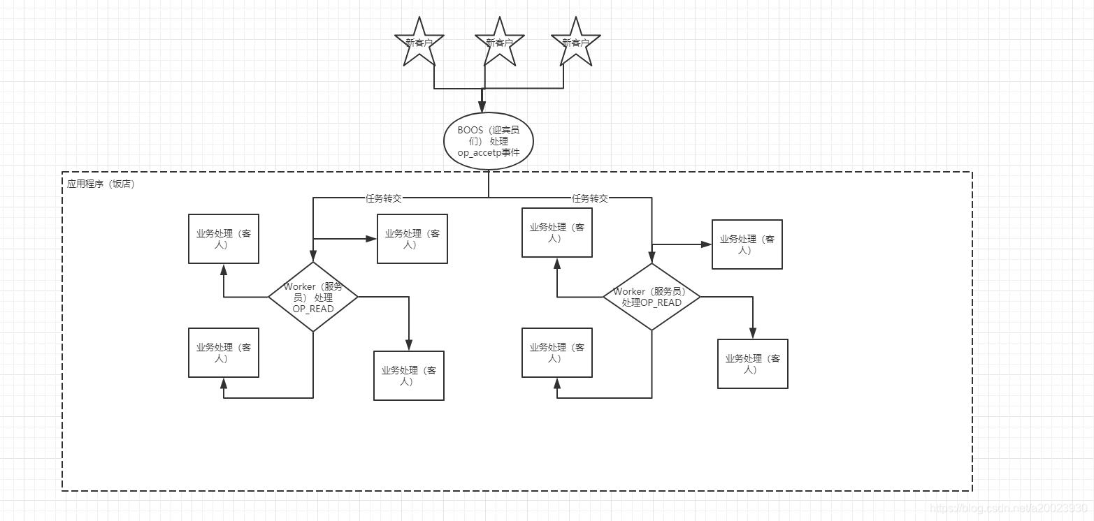 上面的这两个问题就好比我们去饭店点餐吃饭,如果就一个服务员(selector)。 既要在门口迎宾(serverChannel.register(selector, SelectionKey.OP_ACCEPT)后的相关处理),又要服务每一桌上的客人(channel.register(this.selector, SelectionKey.OP_READ)后的相关处理)。这种工作模式在有很多的客户情况下肯定是支撑不了的。要提高并发就要解决这个问题。