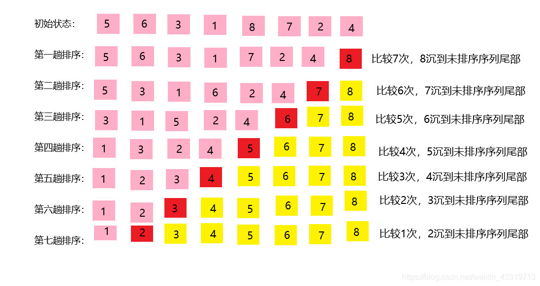 2.参加比较的两个元素是相临的,每轮比较可以找出 一个本轮最大放在本轮最后,使所有小数前移位置;