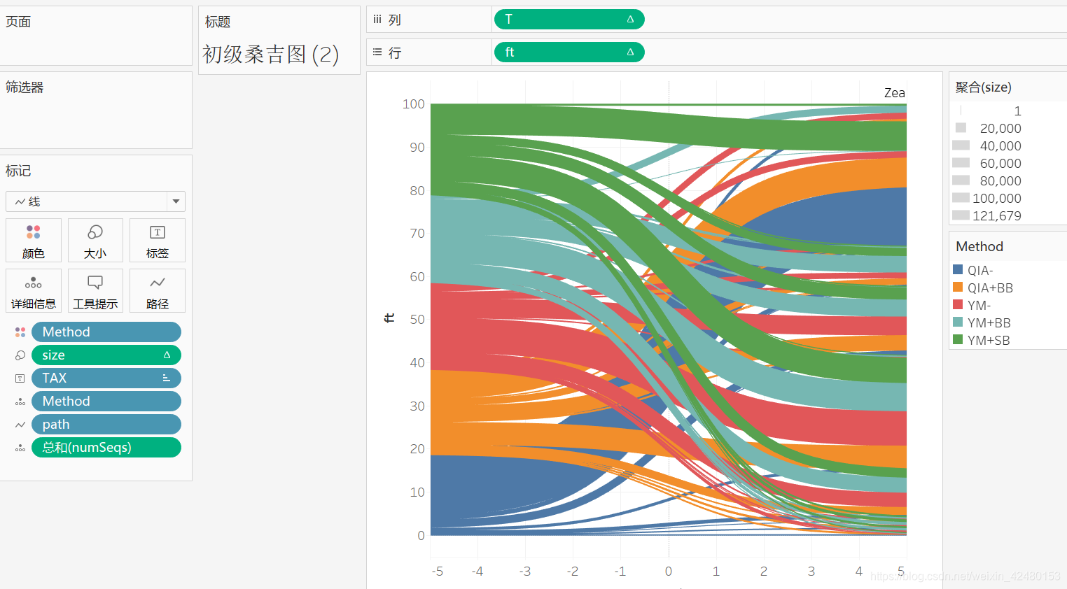 再创建size字段,主要用于表示大小,RUNNING_AVG(sum(([numSeqs]))计算依据是path,因为在这个path中的49个点中有2个序列数的值,所以求平均,其实求和也没啥毛病。