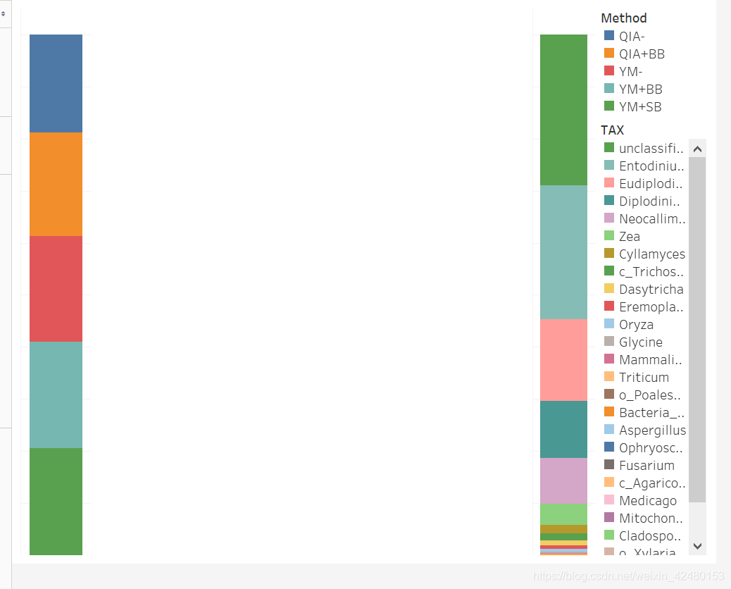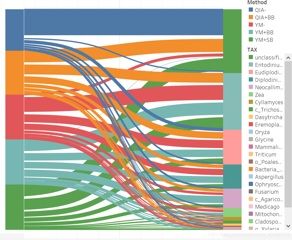 由2个堆叠柱形图,一个logistic曲线构成。曲线的起点连接method、终点连接tax,宽度表示这部分序列占总序列的比例。从左柱形图往右柱形图看就是说明每种方法得到序列都是被注释成了什么、且可以看出比例是多少;倒过来看就是某种物种都是来自于哪些方法得到的序列、也可以看出比例是多少。