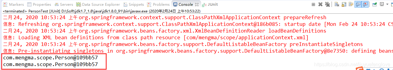 从上图可以看到,两次输出的结果相同,这说明 Spring 容器只创建了一个 Person 类的实例。由于 Spring 容器默认作用域是 singleton,如果不设置 scope="singleton",则其输出结果也将是一个实例。