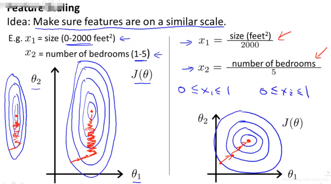 问题描述:如上左图,如果取值θ1=(0 ,5),θ2=(0,2000),则代价函数的2D图会如左图所示,很狭长,在用梯度下降算法寻找最小值的路线可能是弯弯曲曲,需要废掉很长的时间;
