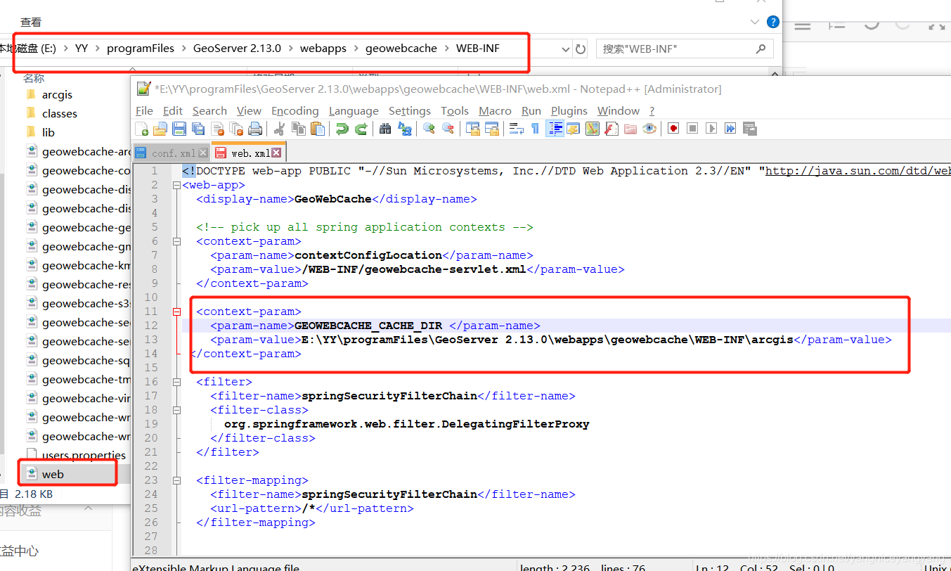 配置:打开geowebcache\WEB-INF\web.xml,加入如下节点(arcgis文件夹路径需要先手动创建好)