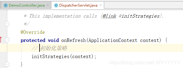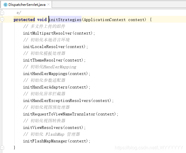 DispatcherServlet中的onRefresh(),该⽅法中初始化了九⼤组件
