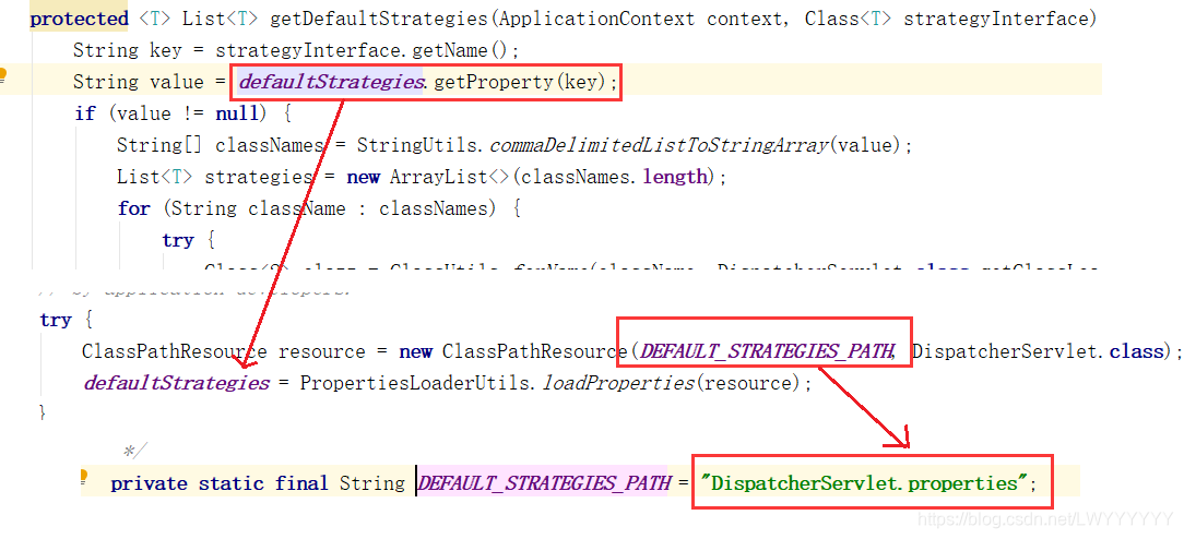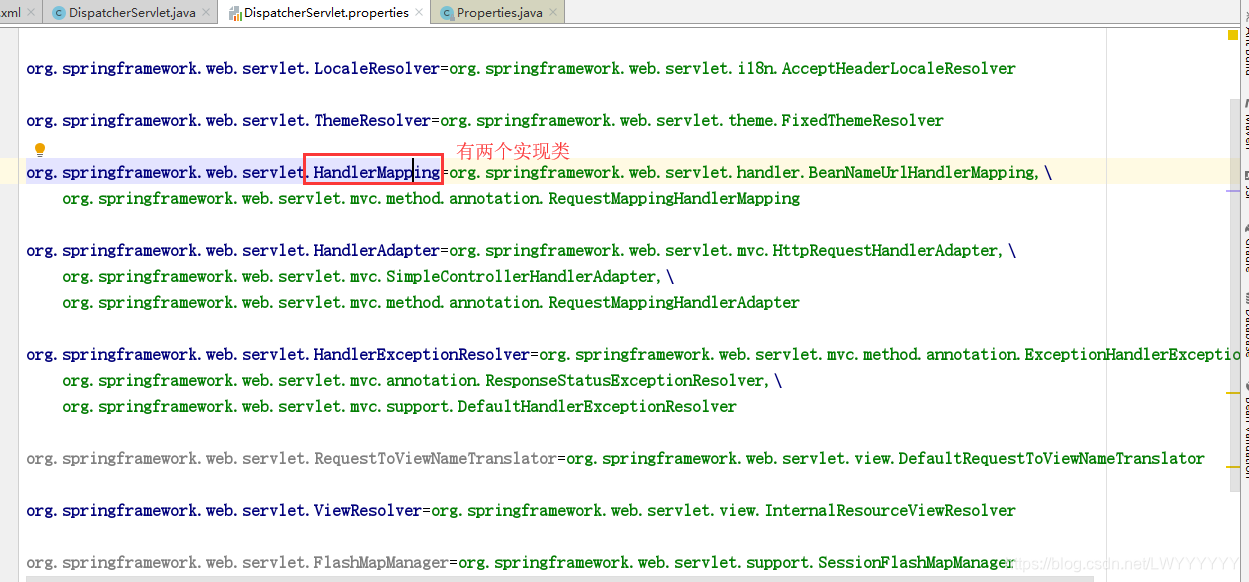 如果按照类型和按照固定id从ioc容器中找不到对应组件,则会按照默认策略进⾏注册初始化,默认策略在DispatcherServlet.properties⽂件中配置