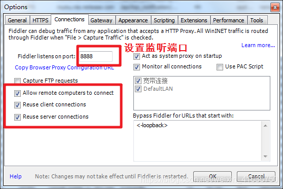 2、设置fiddler监听端口以及远程连接配置