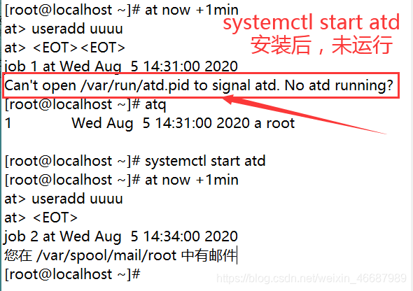 (1)如果你是最小化安装的 centos 系统,你需要自己装一下 at 程序,然后如下图所示需要 start 程序