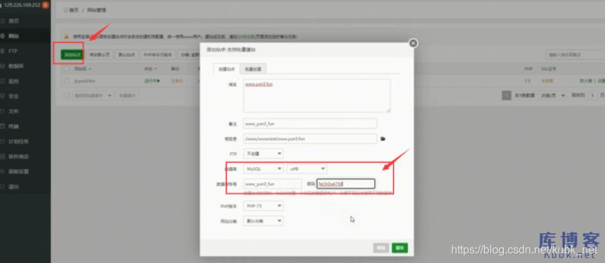 接着,在宝塔面板点击“添加站点”,输入域名,并创建一个与之前网站一样的数据库名和用户名及密码。
