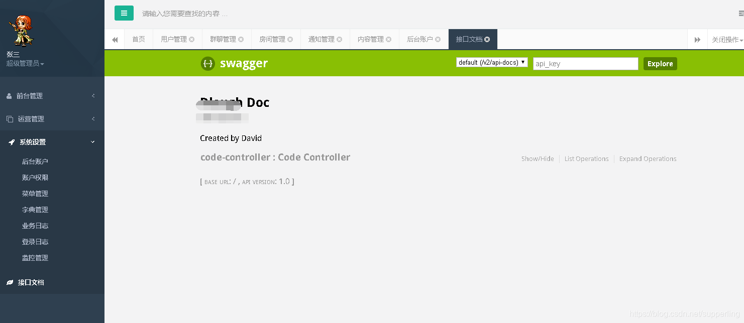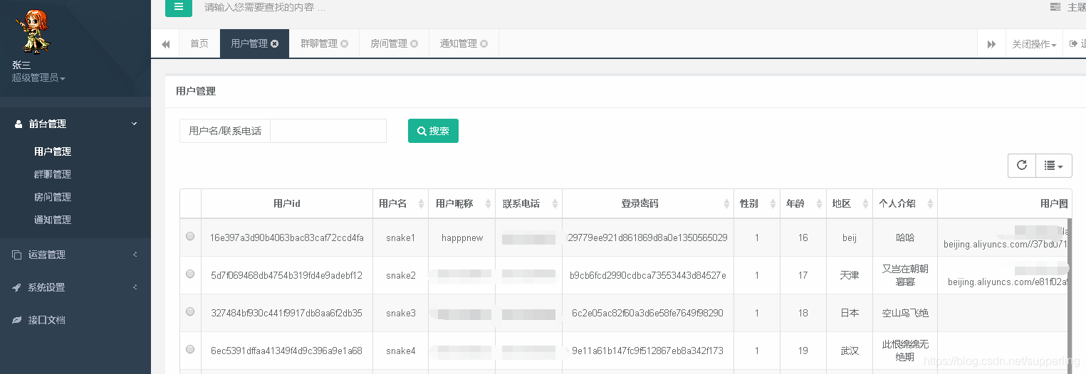 二、 前台管理模块:管理核心功能,包括用户,群组,聊天室的增删改查,