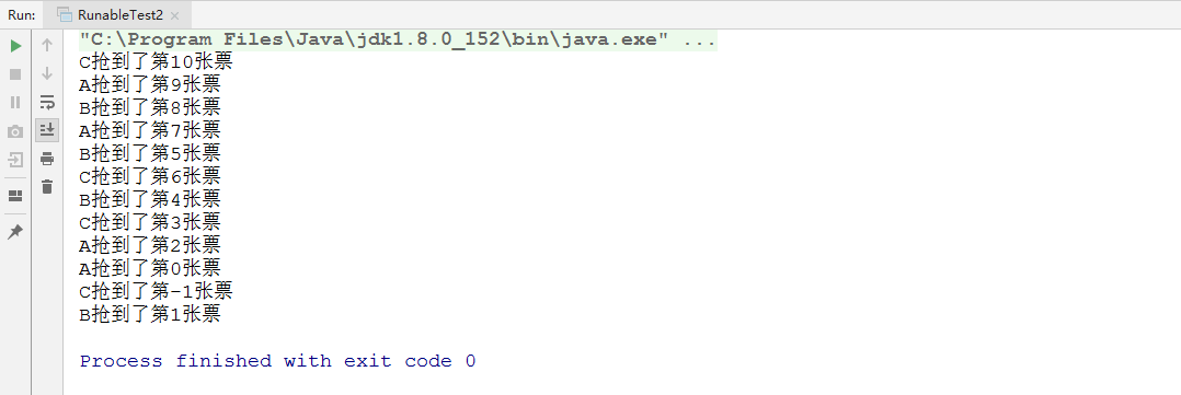 public class RunableTest2 implements Runnable{ //定义票数 private int ticketNum=10; @Override public void run() { try { test(); } catch (InterruptedException e) { e.printStackTrace(); } } private void test() throws InterruptedException { while (true){ if (ticketNum<=0){ break; } //加入休眠,放大问题发生性 Thread.currentThread().sleep(1000); //抢票 System.out.println(Thread.currentThread().getName()+"抢到了第"+(ticketNum--)+"张票"); } } public static void main(String[] args) { //创建实现Runnable接口的实例 RunableTest2 runableTest2 = new RunableTest2(); //创建三个线程同步执行同一实例中run方法 模拟三人同抢一张票 Thread threadA = new Thread(runableTest2, "A"); Thread threadB = new Thread(runableTest2, "B"); Thread threadC = new Thread(runableTest2, "C"); //开启进程 threadA.start(); threadB.start(); threadC.start(); } } - 运行结果:由于多个线程同时操作一个对象,出现了数据紊乱的现象,本代码还未解决并发问题,因此出现了剩余票数