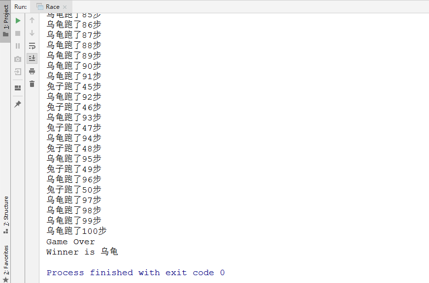 public class Race implements Runnable{ private static String winner;//冠军只有一个,因此用static修饰 @Override public void run() { //定义一个全长为100步的赛道 for (int Step = 1; Step <= 100; Step++) { System.out.println(Thread.currentThread().getName()+"跑了"+Step+"步"); //兔子跑的太快,让兔子每50步休眠10ms if (Thread.currentThread().getName().equals("兔子")&&Step%50==0){ try { Thread.sleep(10); } catch (InterruptedException e) { e.printStackTrace(); } } //判断比赛是否结束 boolean flag = gameOver(Step); if (flag){ break; } } } //判断比赛是否结束 private boolean gameOver(int step){ if (winner!=null){//如果存在胜利者 return true; } if (step==100){//如果跑完了全程 winner=Thread.currentThread().getName(); System.out.println("Game Over"); System.out.println("Winner is "+winner); return true; } return false; } public static void main(String[] args) { Race race = new Race(); Thread thread1 = new Thread(race, "兔子"); Thread thread2 = new Thread(race, "乌龟"); thread1.start(); thread2.start(); } } - 运行结果: