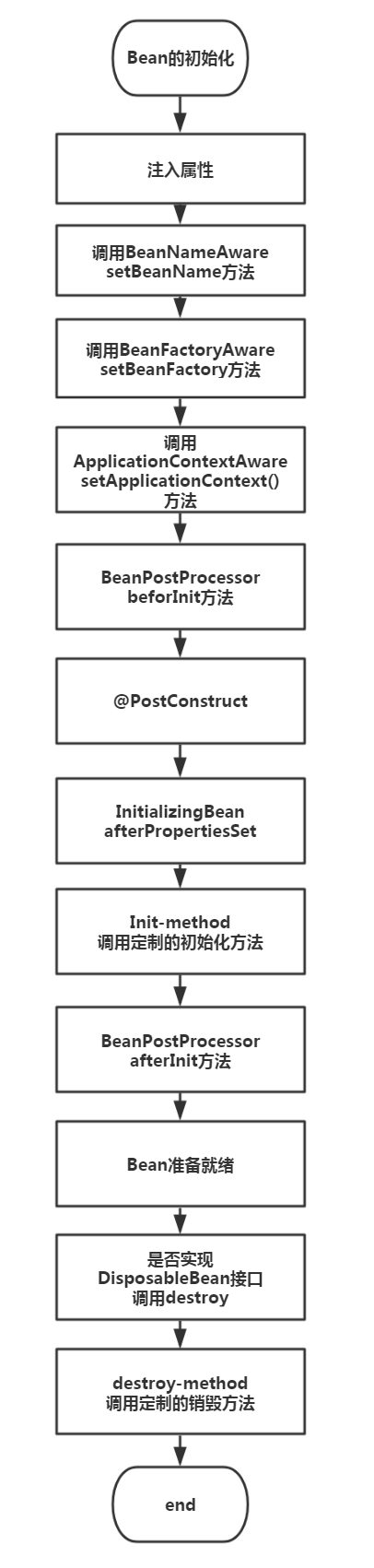 - 以上步骤,bean对象已经正确构造,通过实现BeanPostProcessor接口,可以再进行一些自定义方法处理,如:postProcessBeforeInitialzation