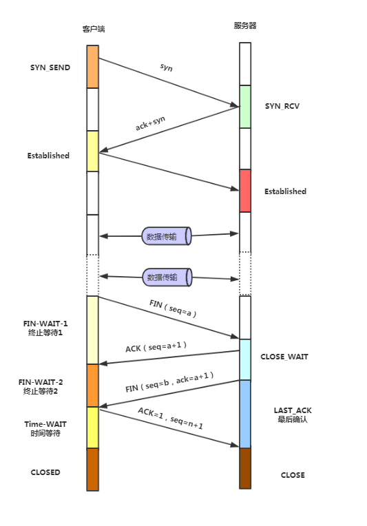 - 第三次挥手(FIN=1,seq=b),发送完毕后,服务器端进入LAST_ACK状态,等待来自客户端的最后一个ACK