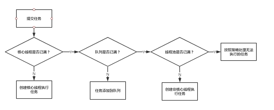- 提交一个任务,线程池例存活的核心线程数小于线程数corePoolSize时,线程池会创建一个核心线程去处理提交得任务。
