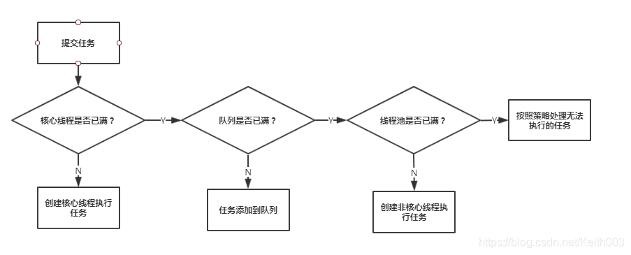 - 如果线程池核心线程数已满,即线程数已经等于corePoolSize,一个新提交得任务,会被放进任务队列workQueue排队等待执行。