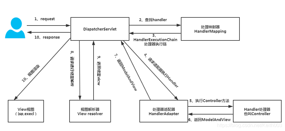- User向服务器发送request,前端控制Servelt DispatcherServlet捕获;