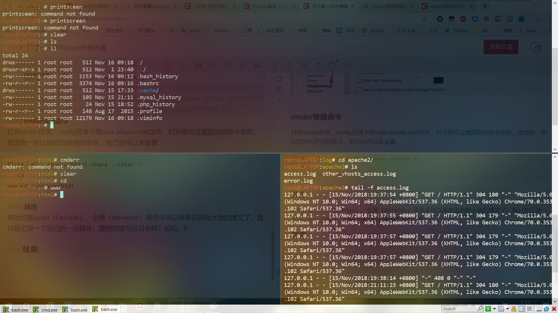 到Microsoft store中下载Ubuntu即可得到Linux的bash,在命令行中输入bash即可进入Ubuntu18.04环境,再通过cmder打开之即可。一通配置后即可正常使用了,我主要是配一下web环境,毕竟PHPstudy中一些环境和真实服务中还是有些不同的,同样一些在Windows中不好安装的python库也可以在Linux子系统中安装实现。