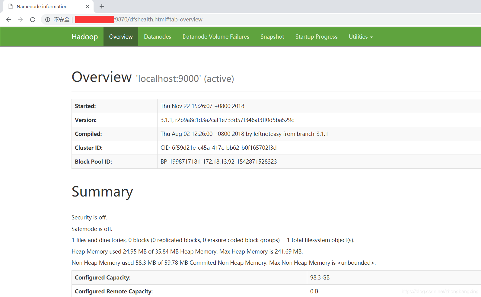 按照以上步骤安装成功后,可以通过默认端口(9870)查看监控(http://127.0.0.1:9870)