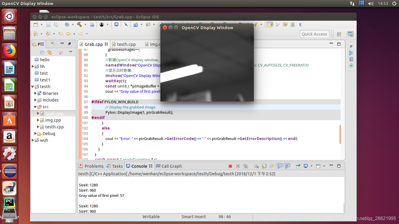 /* * Grab.cpp * * Created on: 2018年11月30日 * Author: wenhan */ #define saveImages 1 // Include files to use the PYLON API. #include <pylon/PylonIncludes.h> #ifdef PYLON_WIN_BUILD # include <pylon/PylonGUI.h> #endif #include <opencv2/core/core.hpp> #include <opencv2/highgui/highgui.hpp> #include <opencv2/video/video.hpp> // Namespace for using pylon objects. using namespace Pylon; // Namespace for using cout. using namespace std; using namespace cv; // Number of images to be grabbed. static const uint32_t c_countOfImagesToGrab = 100; // int main(int argc, char* argv[]) { Mat src; CImageFormatConverter formatConverter; formatConverter.OutputPixelFormat = PixelType_BGR8packed; int grabbedlmages = 0; // 创建一个Pylonlmage后续将用来创建OpenCV images CPylonImage pylonImage; // The exit code of the sample application. int exitCode = 0; // Before using any pylon methods, the pylon runtime must be initialized. PylonInitialize(); try { // Create an instant camera object with the camera device found first. CInstantCamera camera( CTlFactory::GetInstance().CreateFirstDevice()); // Print the model name of the camera. cout << "Using device " << camera.GetDeviceInfo().GetModelName() << endl; // The parameter MaxNumBuffer can be used to control the count of buffers // allocated for grabbing. The default value of this parameter is 10. camera.MaxNumBuffer = 5; // Start the grabbing of c_countOfImagesToGrab images. // The camera device is parameterized with a default configuration which // sets up free-running continuous acquisition. camera.StartGrabbing( c_countOfImagesToGrab); // This smart pointer will receive the grab result data. CGrabResultPtr ptrGrabResult; // Camera.StopGrabbing() is called automatically by the RetrieveResult() method // when c_countOfImagesToGrab images have been retrieved. while ( camera.IsGrabbing()) { // Wait for an image and then retrieve it. A timeout of 5000 ms is used. camera.RetrieveResult( 5000, ptrGrabResult, TimeoutHandling_ThrowException); // Image grabbed successfully? if (ptrGrabResult->GrabSucceeded()) { // Access the image data. cout << "SizeX: " << ptrGrabResult->GetWidth() << endl; cout << "SizeY: " << ptrGrabResult->GetHeight() << endl; formatConverter.Convert(pylonImage, ptrGrabResult); src = cv::Mat(ptrGrabResult->GetHeight(), ptrGrabResult->GetWidth(), CV_8UC3, (uint8_t *) pylonImage.GetBuffer()); //如果需要保存图片 if (saveImages) { std::ostringstream s; // 按索引定义文件名存储图片 s << "/home/wenhan/img/image_" << grabbedlmages << ".jpg"; std::string imageName(s.str()); //保存OpenCV image. imwrite(imageName, src); grabbedlmages++; } //新建OpenCV display window. namedWindow("OpenCV Display Window", CV_WINDOW_NORMAL); // other options: CV_AUTOSIZE, CV_FREERATIO //显示及时影像. imshow("OpenCV Display Window", src); waitKey(1); const uint8_t *pImageBuffer = (uint8_t *) ptrGrabResult->GetBuffer(); cout << "Gray value of first pixel: " << (uint32_t) pImageBuffer[0] << endl << endl; #ifdef PYLON_WIN_BUILD // Display the grabbed image. Pylon::DisplayImage(1, ptrGrabResult); #endif } else { cout << "Error: " << ptrGrabResult->GetErrorCode() << " " << ptrGrabResult->GetErrorDescription() << endl; } } } catch (const GenericException &e) { // Error handling. cerr << "An exception occurred." << endl << e.GetDescription() << endl; exitCode = 1; } // Comment the following two lines to disable waiting on exit. cerr << endl << "Press Enter to exit." << endl; while( cin.get() != '\n'); // Releases all pylon resources. PylonTerminate(); return exitCode; } 效果图:
