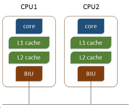 多核CPU,不同的核通过L2 cache进行通信,存储和外设通过总线与CPU通信,如下: