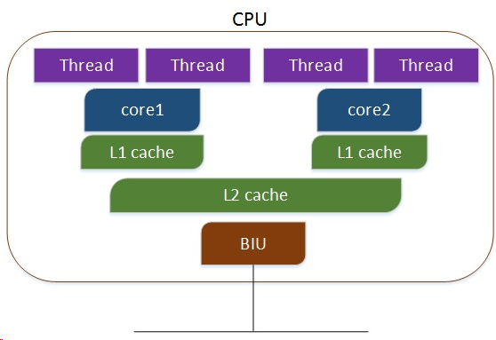 多核超线程,每个核有两个逻辑的处理单元,两个核共同分享一个核的资源,如下: