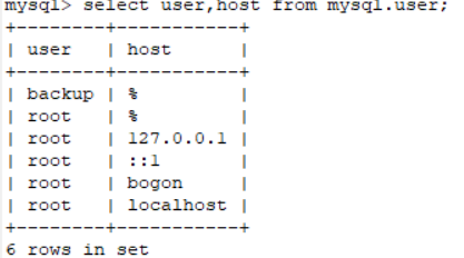mysql>select user,host from mysql.user;