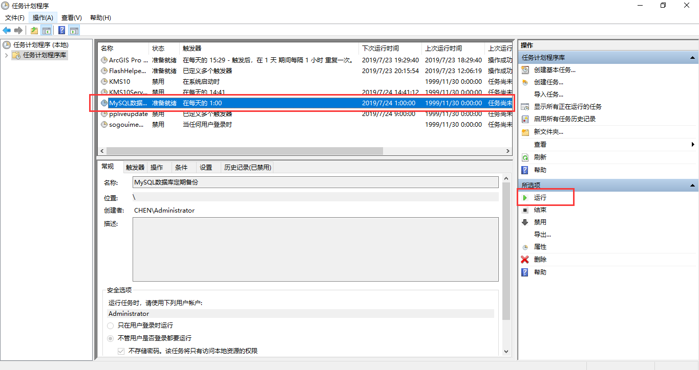 @echo off echo 正在建立数据库备份... D: cd D:\Program Files\MySQL\bin set "Ymd=%date:~,4%%date:~5,2%%date:~8,2%" echo 正在备份全部数据库 mysqldump --no-defaults --events --all-databases -uroot -proot >E:\MySQLBak\%Ymd%_all.sql echo 正在备份业务数据库 mysqldump --no-defaults --events -uroot -proot --databases bussDB>E:\MySQLBak\%Ymd%_bussDB.sql echo 备份建立完成! echo ::pause 创建计划任务