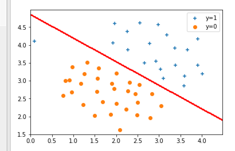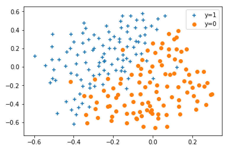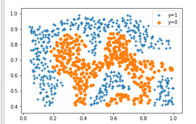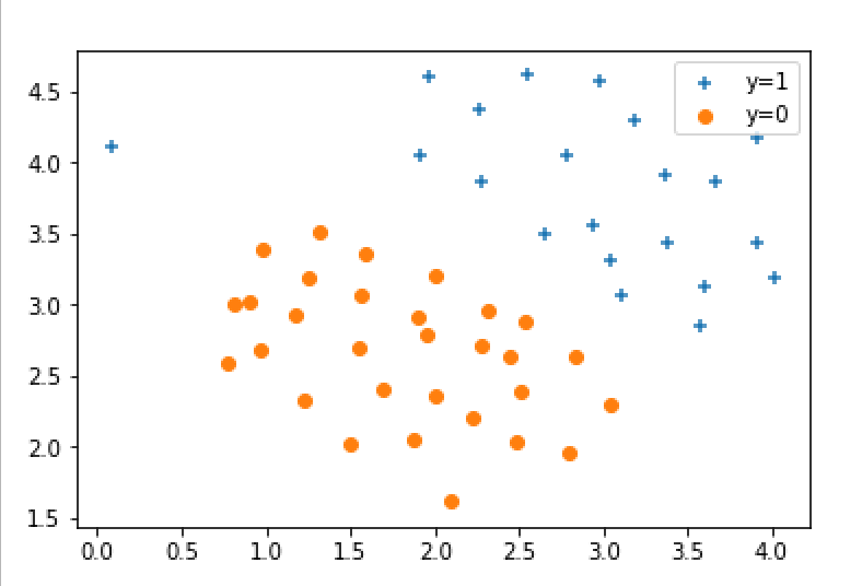 def plot_data(X, y): plt.figure() positive=X[y==1] #提取正样本 negtive=X[y==0] #提取负样本 plt.scatter(positive[:,0],positive[:,1],marker='+',label='y=1') #画出正样本 plt.scatter(negtive[:,0],negtive[:,1],marker='o',label='y=0') #画出负样本 plt.legend() #显示图例 - 数据集1可视化效果