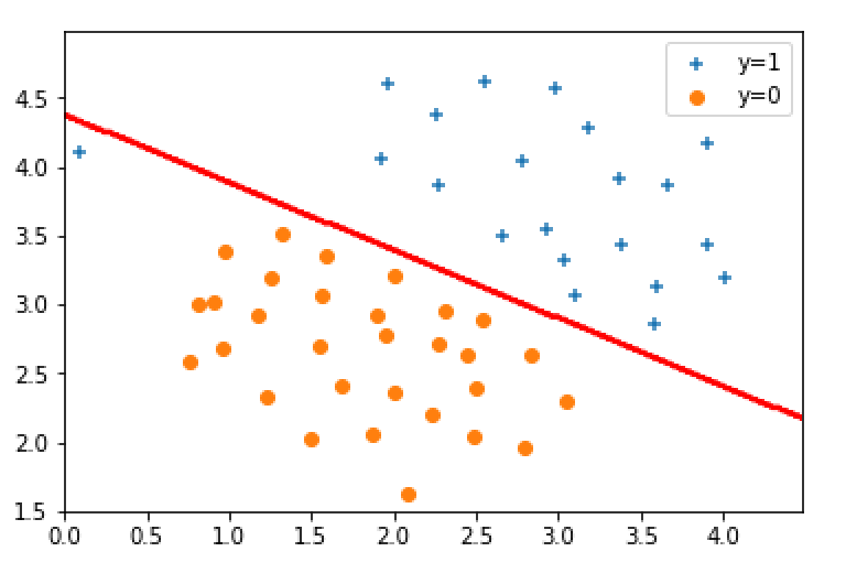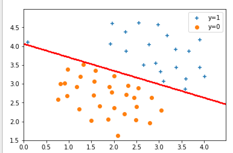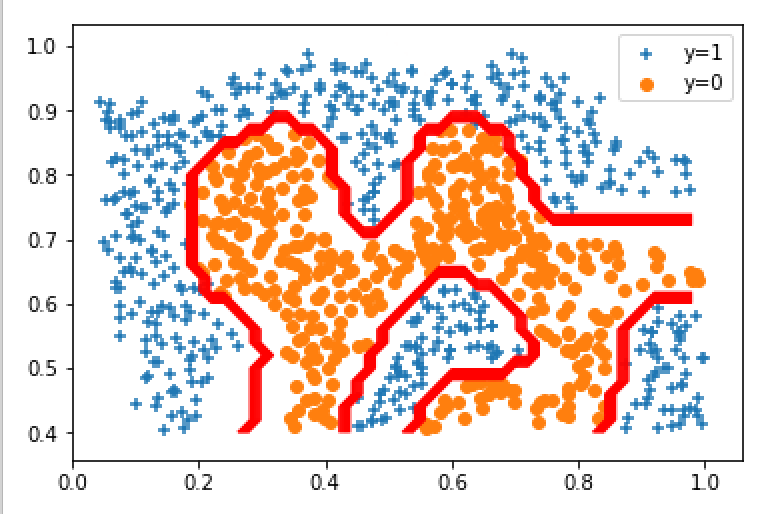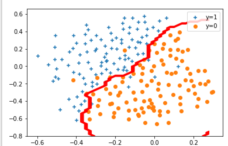 def visualize_boundary(clf, X, x_min, x_max, y_min, y_max): #x,y轴的取值范围 h = .02 xx, yy = np.meshgrid(np.arange(x_min, x_max, h), np.arange(y_min, y_max, h))#在x,y轴上以0.02为间隔,生成网格点 Z = clf.predict(np.c_[xx.ravel(), yy.ravel()])#预测每个网格点的类别0/1 Z = Z.reshape(xx.shape) #转型为网格的形状 plt.contour(xx, yy,Z, level=[0],colors='r') #等高线图 将0/1分界线(决策边界)画出来 - 查看决策边界