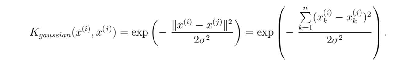 '''第3部分 实现高斯核函数''' print('Evaluating the Gaussian Kernel') x1 = np.array([1, 2, 1]) x2 = np.array([0, 4, -1]) sigma = 2 #高斯核函数参数 sim = gk.gaussian_kernel(x1, x2, sigma) #利用高斯核函数计算两个向量的相似度 print('Gaussian kernel between x1 = [1, 2, 1], x2 = [0, 4, -1], sigma = {} : {:0.6f}\n' '(for sigma = 2, this value should be about 0.324652'.format(sigma, sim)) - 编写高斯核函数gaussianKernel.py