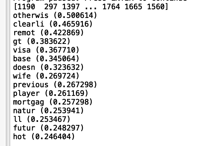 '''第5部分 通过训练好的分类器 打印权重最高的前15个词 邮件中出现这些词更容易是垃圾邮件''' vocab_list = pe.get_vocab_list() #得到词汇表 存在字典中 indices = np.argsort(clf.coef_).flatten()[::-1] #对权重序号进行从大到小排序 并返回 print(indices) for i in range(15): #打印权重最大的前15个词 及其对应的权重 print('{} ({:0.6f})'.format(vocab_list[indices[i]], clf.coef_.flatten()[indices[i]]))