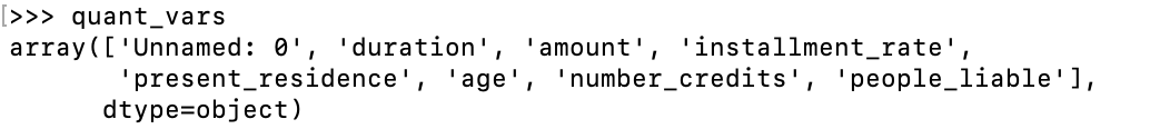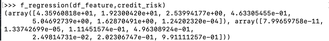 #获取定量指标 quant_index = np.where(data.dtypes=='int64') quant_vars = np.array(data.columns)[quant_index] quant_vars = np.delete(quant_vars,0) df_feature = pd.DataFrame(data,columns=['duration','amount','installment_rate','present_residence','age','number_credits','people_liable']) f_regression(df_feature,credit_risk) #输出逐步回归后得到的变量,选择P值<=0.1的变量 quant_model_vars = ["duration","amount","age","installment_rate"] 四、定性指标筛选