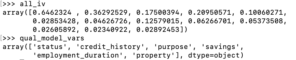 def woe(bad, good): return np.log((bad/bad.sum())/(good/good.sum())) all_iv = np.empty(len(factor_vars)) woe_dict = dict() #存起来后续有用 i = 0 for var in factor_vars: data_group = data.groupby(var)['credit_risk'].agg([np.sum,len]) bad = data_group['sum'] good = data_group['len']-bad woe_dict[var] = woe(bad,good) iv = ((bad/bad.sum()-good/good.sum())*woe(bad,good)).sum() all_iv[i] = iv i = i+1 high_index = np.where(all_iv>0.1) qual_model_vars = factor_vars[high_index]